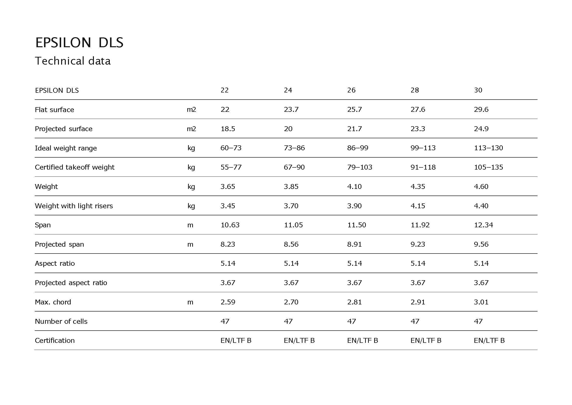 EPSILON DLS è stato progettato con gli stessi range di peso in mente, questo permette di poter scegliere la vela della taglia che si preferisce in base alle proprie preferenze di utilizzo. Nella relativa gamma di peso ideale al decollo, l'EPSILON DLS offre il miglior equilibrio tra velocità di volo e prestazioni di salita per tutte le condizioni di volo.